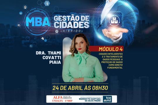 A professora doutora Thami Covatti Piaia vai abordar o tratamento e a proteção de dados pessoais no contexto das cidades inteligentes no 4° módulo do MBA em Gestão de Cidades do Tribunal de Contas de Mato Grosso (TCE-MT). A aula será ministrada a partir das 8h30 desta sexta-feira (24), no auditório da Escola Superior de Contas.